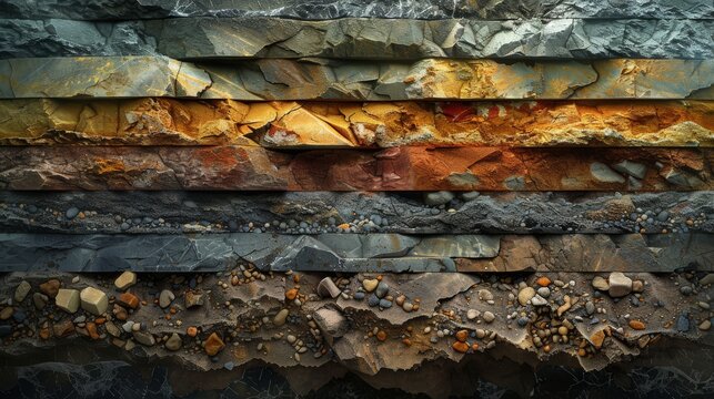 Cross-section of rock strata with various geological layers and textures
