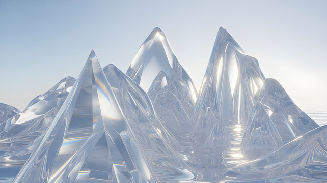 Mountains made of transparent crystal glass, soft atmospheric light, ultra high detail, surreal stock photography style