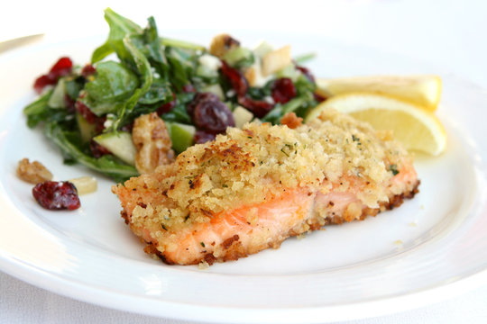 Panko crusted baked chicken drumsticks with greens on wooden table
