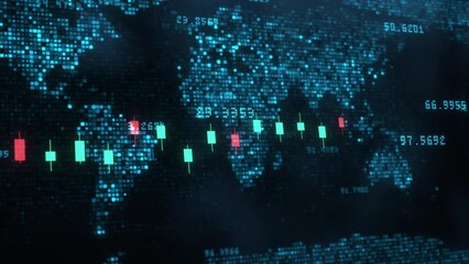 Closeup of stock market volatility of crypto trading with technical price graph and indicator, red and green candlesticks on blue display background