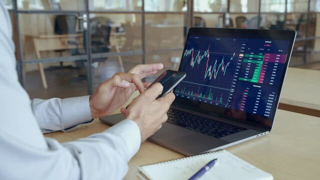 Crypto trader investor broker holding using smartphone app analyzing financial data stock market price on cell phone, checking online trading platform application, buying cryptocurrency.