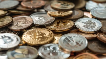 A pile of various cryptocurrencies represented by physical coins, highlighting the future of digital money