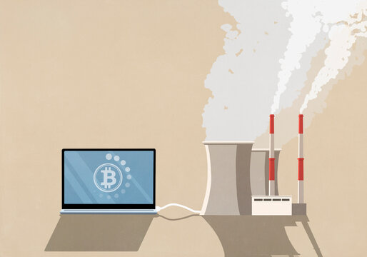 digital display with Bitcoin symbol and fluctuating graphs is set against backdrop of power lines at sunset, symbolizing energy consumption of cryptocurrency mining