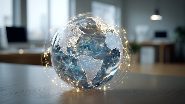 transparent digital earth floating over office desk with glowing connection lines, global finance, fintech technology