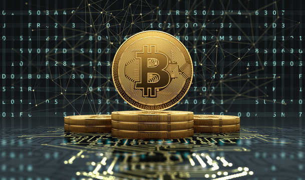 golden bitcoin coin fiery scene surrounded cryptocurrency symbols networks various weather