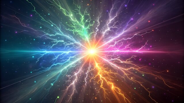 Colorful light explosion with cyan, lime green, magenta, and orange rays, crystalline shards, and glowing particles, producing intense abstract visual energy