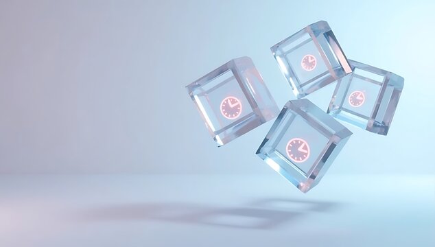 Transparent crystalline cubes floating in mid-air, each containing glowing clocks, watches, or time symbols, calm pastel environment, soft shadows, metaphor for productivity, scheduling, time control,