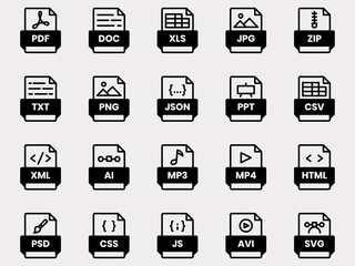 File Format Icon Set Vector Illustration—PNG, PDF, DOC, XLS, MP4, JPG, CSV, TXT—Minimal Outline Design for Digital and Document Management on Transparent Background