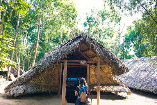 Tourists visiting Viet Cong Tunnels near Ho Chi Minh City. Cu Chi tunnel, historic famous place in Vietnam war