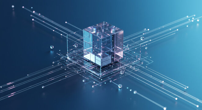 Futuristic digital cube with a glowing core, representing an advanced AI processor and quantum computing technology