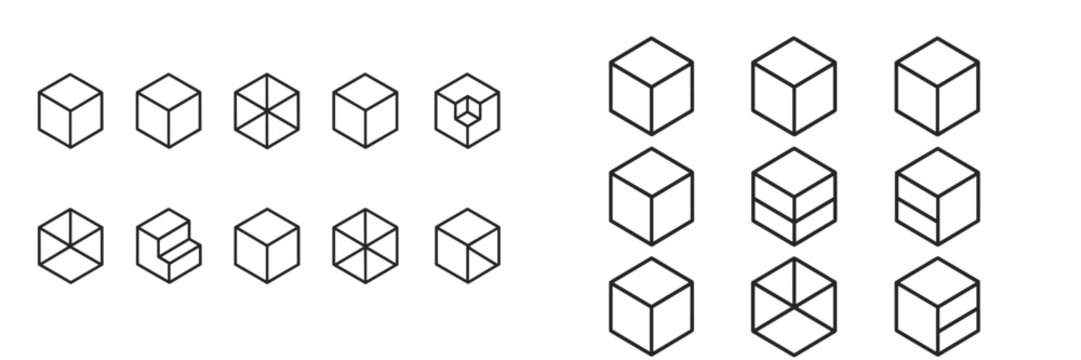 Collection of various cube outlines in isometric perspective, featuring single cubes, stacked cubes, and complex geometric arrangements, perfect for infographics, articles, books, flyers, and