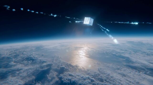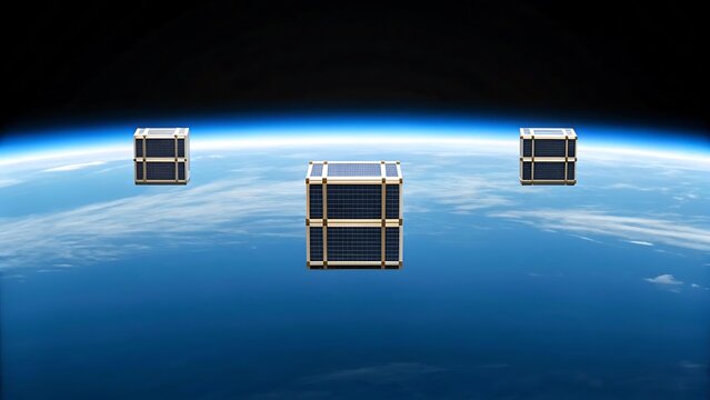 CubeSat satellite orbiting Earth, showcasing its deployable solar panels and sophisticated design