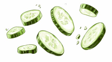 Cucumber slices in motion, depicted as if in mid-air.
