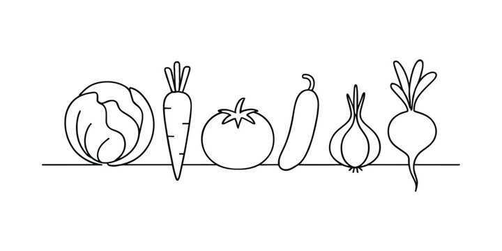 One line vegetables and fruits. Hand drawn groceries, healthy and natural vegan food continuous line vector Illustration set
