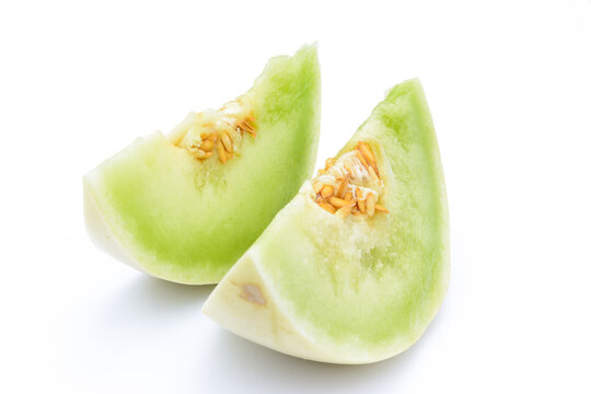 trozos de Melón Dulce Calameño (Cucumis melo) en fondo blanco