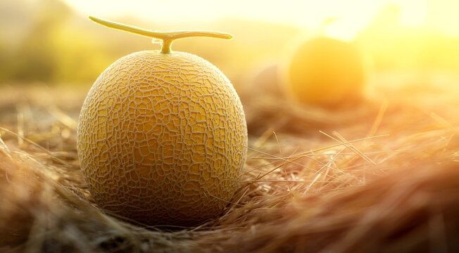 Ripe cantaloupe melons growing in a field, ready for harvest