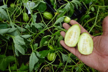 man holding fruit of cucumis anguria, halved, West Indian cucumber crop or ripe and harvested cucumber hedgehog cucumber