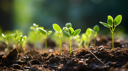 A close-up view of a group of young plant saplings emerging from the soil under the warm sunshine.