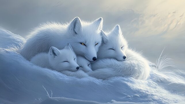 A family of snowy white arctic foxes snugly curled together on a windswept icy expanse