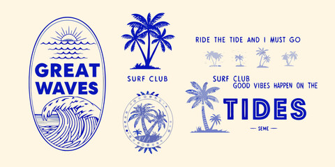 Retro surf club emblems and slogans featuring palm trees and ocean waves in blue ink