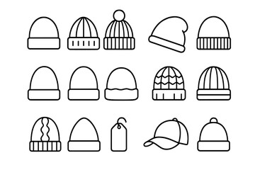 Cozy Beanie Icon Set. Cozy headwear. Line icon set of Cozy headwear: slouchy beanie, knitted beanie, cuffed beanie, pom-pom beanie, folded beanie, wool hat,