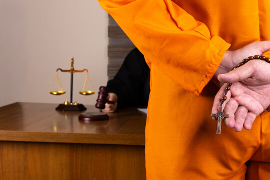 A defendant, with hands cuffed and holding a rosary, stands in a courtroom