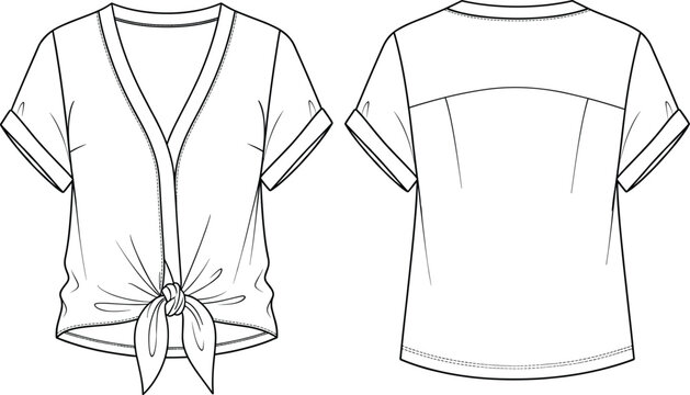 Women's cropped wrap blouse technical flat – long sleeve tie-front top with V-neck and cuffed sleeves; front and back CAD vector fashion design sketch.