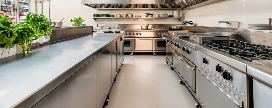 A spacious, modern kitchen featuring stainless steel appliances, large countertops, and organized storage, perfect for culinary activities.