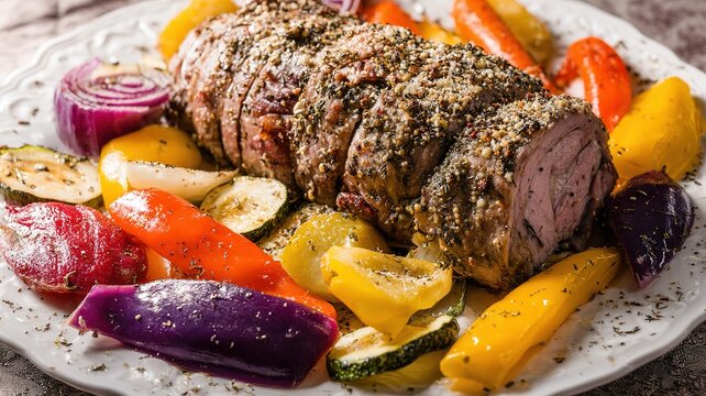 色鮮やかな旬の野菜を添えたローストポーク料理を、温かみのある照明とともにお召し上がりください。