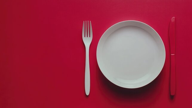 Culinary Challenge with Minimalist Plate Fork and Knife on Bold Red Background for Creative Text Design and Marketing Use