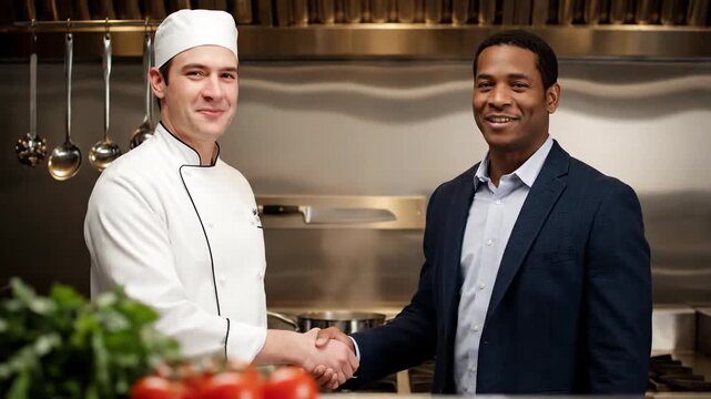Smiling culinary professional and astute businessman solidify their successful collaboration with a firm handshake in a modern commercial kitchen setting