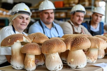 Mushroom harvesters showcasing their prized finds at a local market in the fall