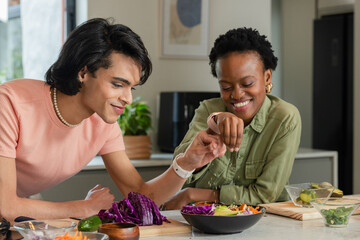 A joyful couple is preparing a meal in a cozy kitchen, sharing laughter and teamwork, representing love and collaboration in the culinary experience.