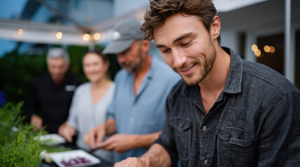 A cheerful group of friends participates in outdoor food preparation, showcasing collaboration and culinary creativity in a relaxed atmosphere filled with joy.