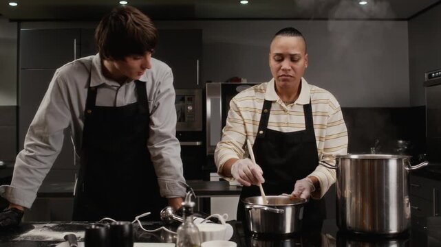 Focused multiethnic female chef stirring sauce in pot demonstrating cooking technique to male trainee during group culinary class in restaurant kitchen