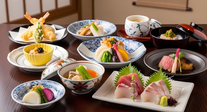 An array of beautifully arranged Japanese cuisine dishes, including tempura, sashimi, and various small plates, are presented on a dark wooden table in a traditional setting.