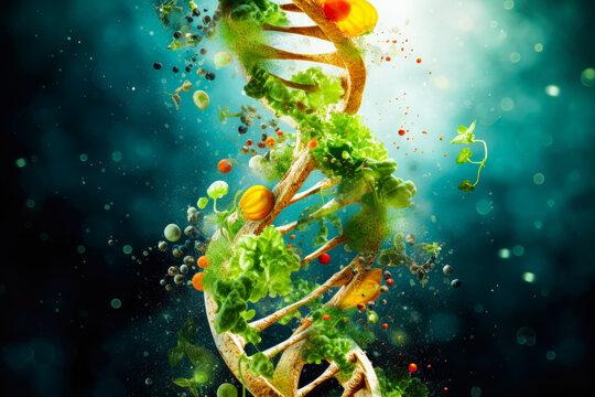 Juicy gourmet burgers with fresh toppings floating in scientific DNA background. Junk Food Gene, FTO, biotechnology, culinary science concepts.