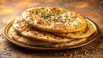 Golden-brown flatbreads sprinkled with seeds, stacked on an ornate metallic plate, a culinary delight