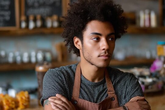 A focused young chef stands in a bustling kitchen, surrounded by fellow cooks, showcasing determination and culinary ambition.