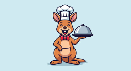 A cartoon kangaroo wearing a chef's hat and red bow tie holds a covered dish against a light blue background.