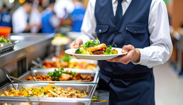 Server holds plate of food in a buffet line, with many other food trays and blurred people in the background, lit by natural light