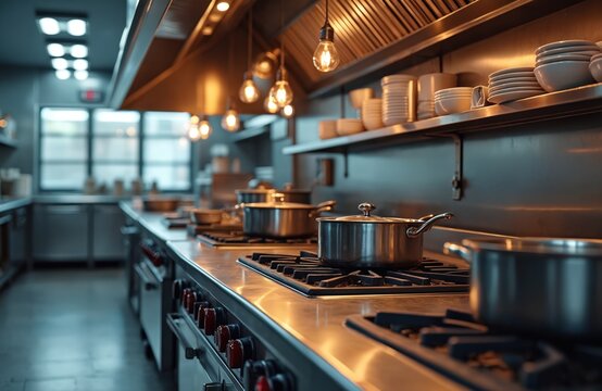 Pro empty restaurant kitchen interior view with metal equipment. Stoves and pans stand on tables. Shelves hold plates and dishes. Lights hang above cooking area in modern eatery.
