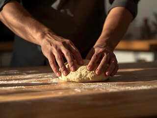 Close-up of skilled hands expertly kneading fresh dough on a rustic wooden table, embodying the timeless art of homemade baking and culinary creation