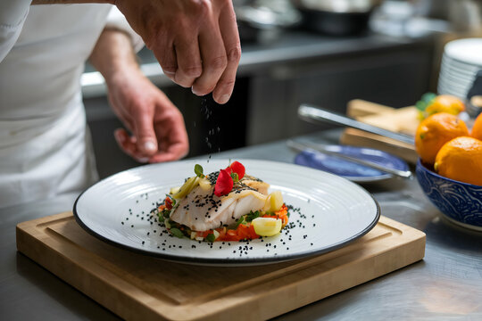 Chef sprinkles sesame seeds over gourmet dish, showcasing culinary finesse