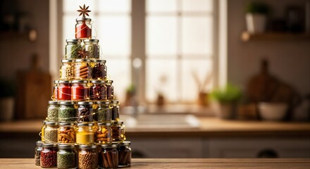 Creative Christmas tree made from various spice jars with festive lights on a rustic kitchen counter, celebrating holiday cooking and culinary joy