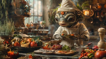 Half-human creature with anthropomorphic traits cooking in a whimsical kitchen, showcasing imagination and culinary arts