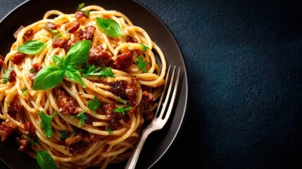 This image showcases a plate of spaghetti pasta topped with rich tomato sauce, garnished with fresh basil leaves, and plated elegantly for a delicious meal experience.