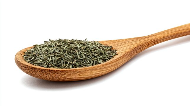 Wooden spoon brimming with fragrant dried thyme, perfect for culinary inspiration and gourmet recipes