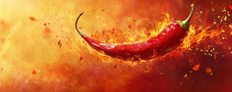 Red chili pepper with flames, vibrant colors, cooking concept, spicy food, creative culinary presentation, bright background showcasing the heat of the pepper, symbolizing intensity and flavor