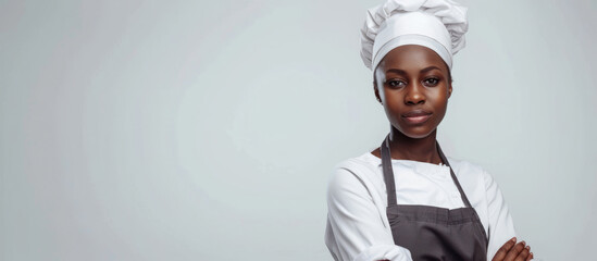 Portrait of a beautiful dark-skinned female cook, with empty space, the woman is positioned on the left side, empty space on the right side, background homogeneous